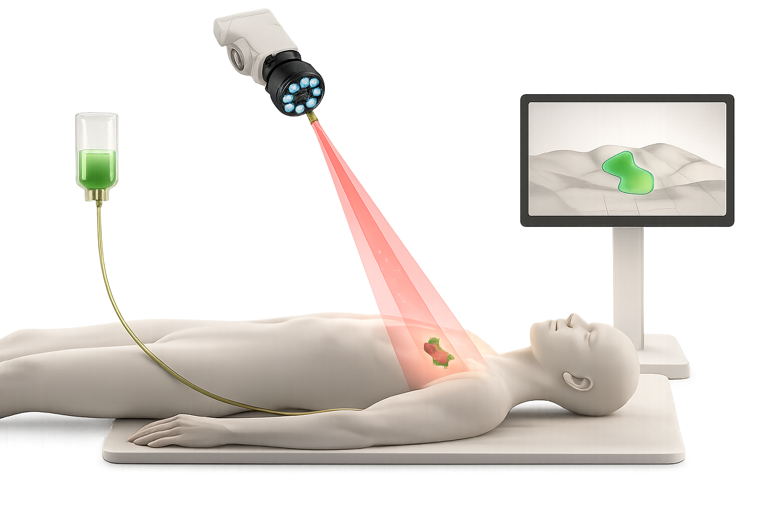 Se utiliza una cámara especial que hace que ciertas partes del cuerpo se iluminen o brillen en una pantalla, mientras el cirujano está operando.